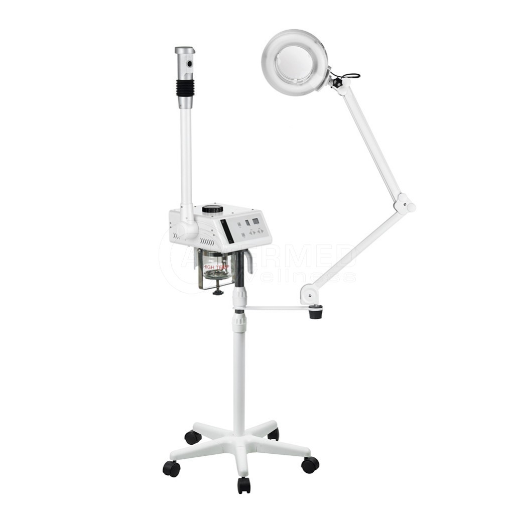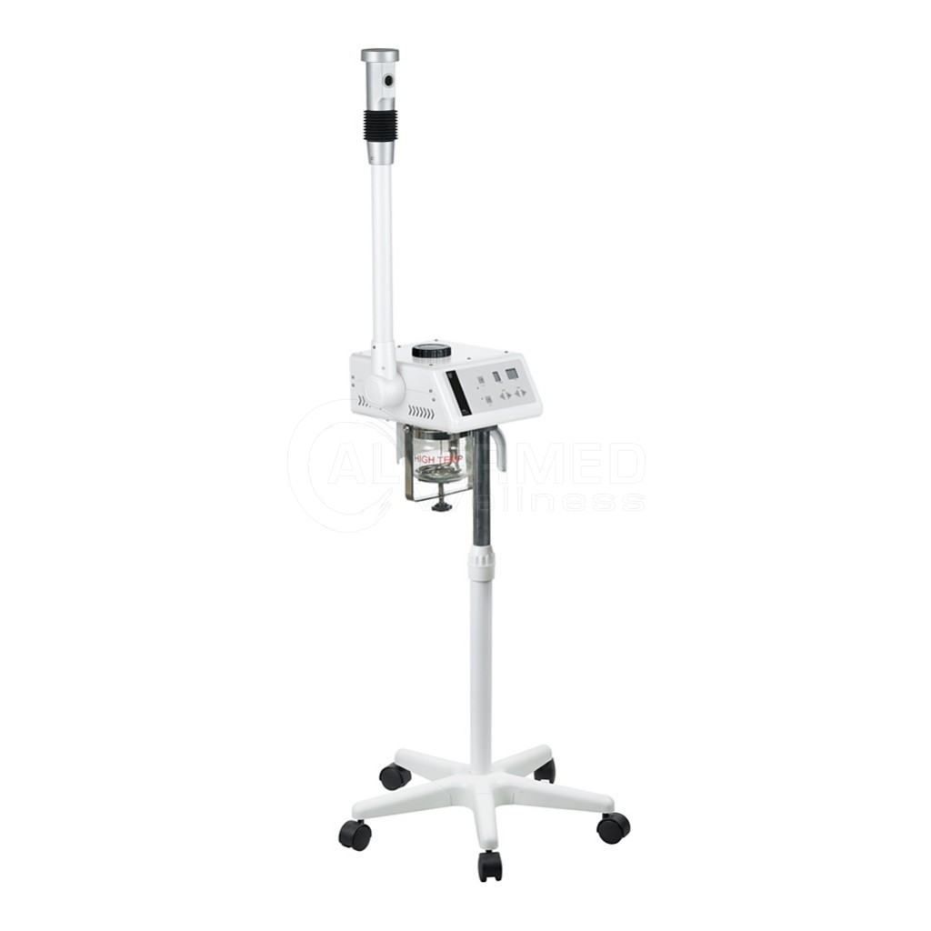 Optimal BodyCare tilbyder denne eksklusiv H-Two ozon digital ansigts damper / dampapparat til udrensende ansigtsbehandlinger. For desinfektion er der ozon funktion. Den leveres i et flot, morderne og funktionelt designet. OBS! Billedet illustrere både en damper og en luplampe, det er kun damperen der bestilles her. Luplampen bestilles seperat. Metal stellet er i hvid og er af stor stabilitet og robusthed. Er justerbar i højden. Den er udstyret med et roterende hoved i 3D. Den er udstyret med en aromatisk olie beholder, og en urtebeholder til dampbehandling. Dampappparatet har ligeledes en filtring til aromastoffer